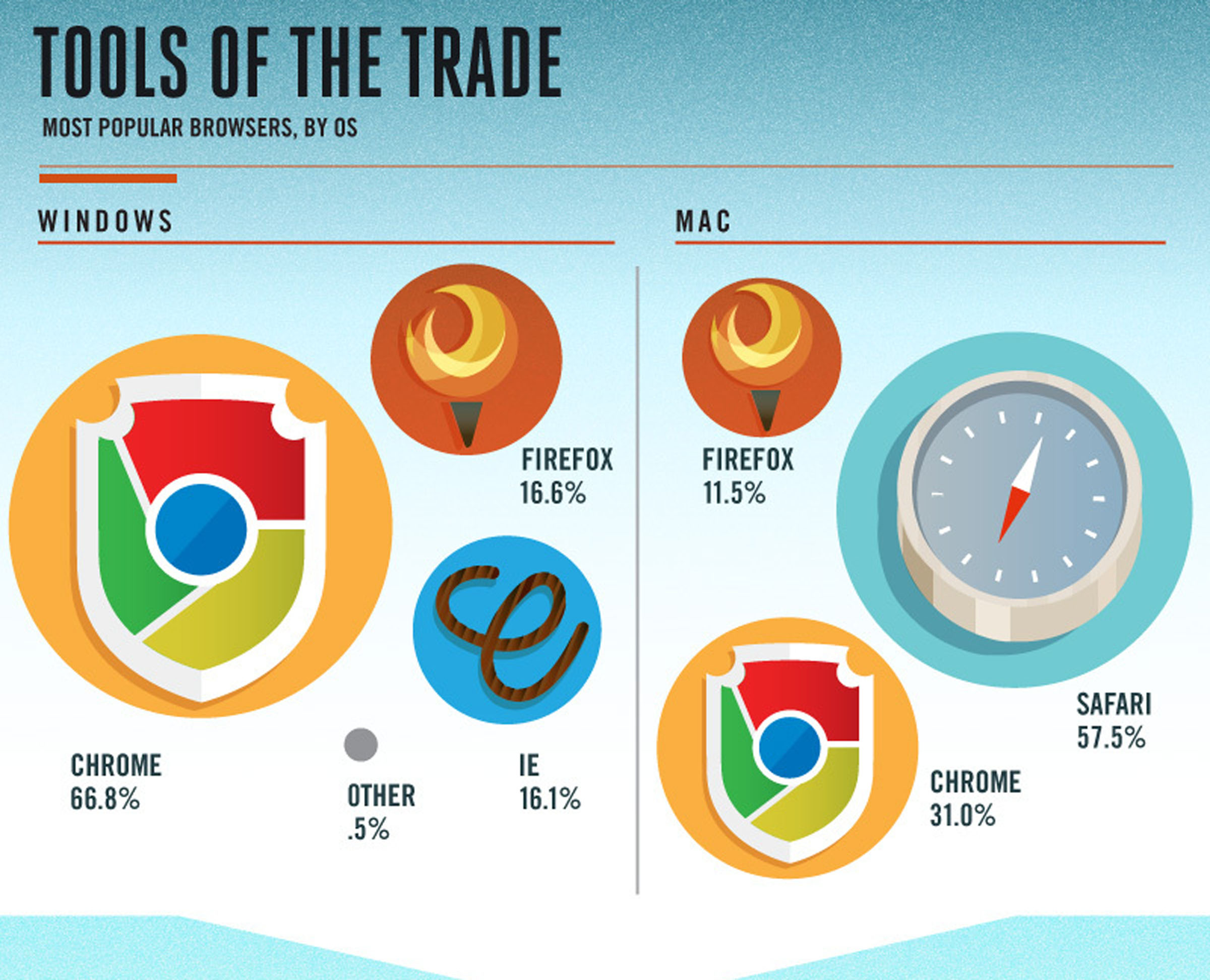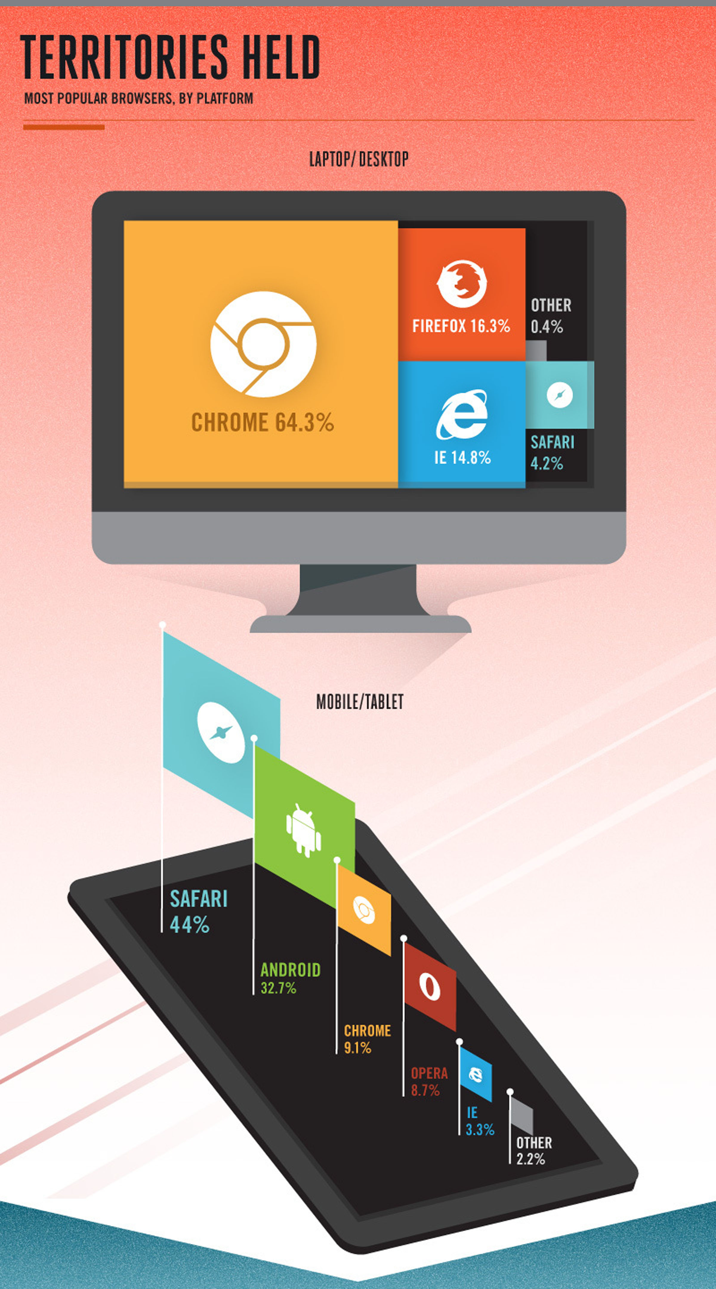 Dalam penelitian itu disebutkan bahwa browser yang paling populer berdasarkan platform adalah untuk laptop/desktop yang paling populer adalah Chrome dengan prosentase 64.3%, diikuti oleh Firefox, Internet Explorer dan Safari. Sedangkan untuk smartphone/tablet, browser yang paling populer adalah Safari dengan prosentase 44%, Android 32.%, Chrome, Opera, dan IE. Sedangkan untuk browser paling populer berdasarkan sistem operasi, di Windows yang terpopuler adalah Chrome dengan nilai 66.8%, Firefox dengan 16.8%, serta IE dengan 16.1%. Dan untuk OS Mac, Safari tentu saja menjadi yang paling populer dengan 57.5%, diikuti Chrome sebanyak 31% dan Firefox 11.5%.