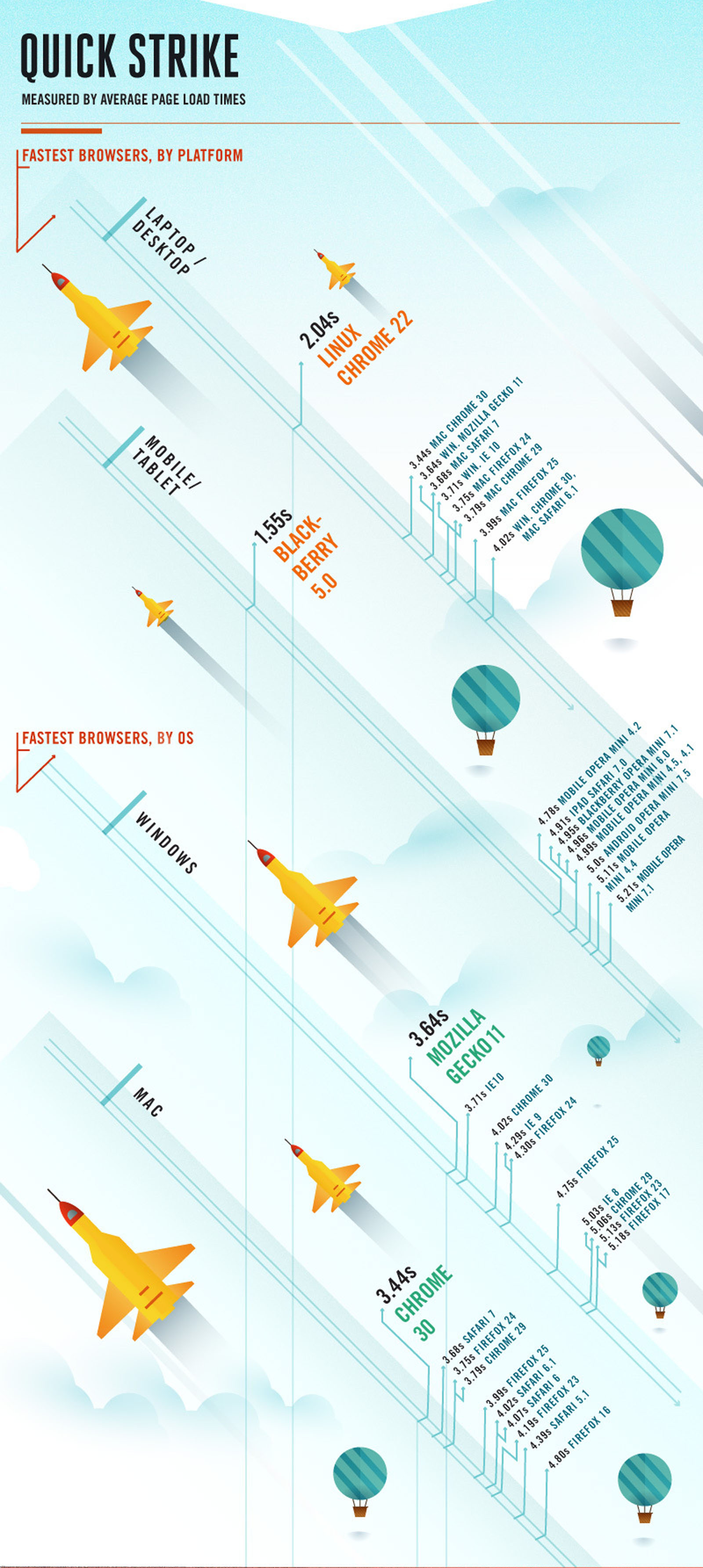 Dan yang terakhir adalah kecepatan browser melakukan loading halaman, dimana untuk platform mobile, browser BlackBerry menduduki posisi pertama dengan waktu 1.55 detik, posisi kedua Mobile Opera Mini 4.2 dengan waktu 4.78 detik sedangkan iPad Safari memakan waktu 4.91 detik. Untuk platform laptop/desktop Linux Chrome dengan 2.04 detik diikuti Mac Chrome 30 dengan waktu 3.44 detik. Dedangkan berdasar OS, untuk Windows yang tercepat adalah Mozilla Gecko 11 dengan waktu 3.64 detik, di tempat kedua IE 10 dengan waktu 3.71 detik, dan untuk Mac posisi pertama adalah Chrome 30 dengan waktu 3.44 detik yang diikuti oleh Safari dengan waktu 3.68 detik.