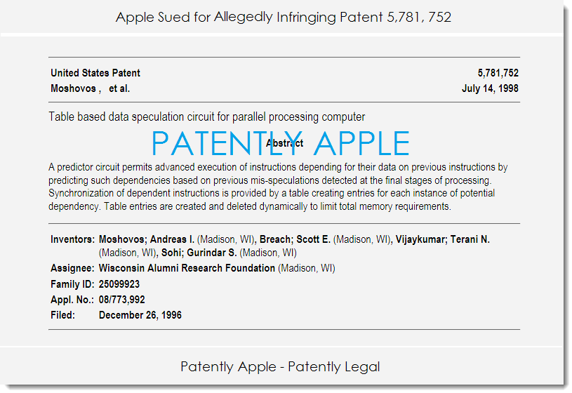 Tuntutan yang diajukan WARF kepada Apple mengklaim bahwa chip 64-bit Apple A7 melanggar paten 5,781,752 yang menjelaskan “table-based data speculation circuit for parallel processing” atau sirkuit spekulasi data berbasis tabel untuk pemrosesan paralel, di mana paten tersebut telah diajukan pada tahun 1996 yang lalu. WARF mengklaim bahwa paten tersebut digunakan oleh Apple agar mendapatkan peningkatan performa dan efisiensi pada chip A7 tersebut. Tentunya, mereka sekarang menginginkan kompensasi dan proteksi yang legal. WARF juga menjelaskan bahwa Apple ternyata memiliki pengetahuan yang jelas tentang paten tersebut.
