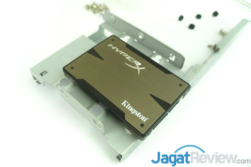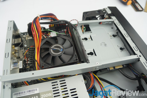 4) Pemasangan perangkat storage tidak terlalu susah karena ada sebuah frame yang bisa dilepas-pasang: Tempat ini bisa memuat satu slim optical drive, dan satu HDD 3.5″, HDD 2.5″, ataupun satu SSD 2.5″