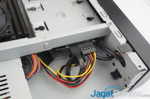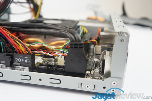 2) Konektor daya pada motherboard tidak sulit diraih meski kabel dari PSU agak pendek, begitu pula konektor front-panel yang lainnya. Disini, cable management memang cukup rumit untuk dikerjakan mengingat terbatasnya ruang gerak di sekitar casing.