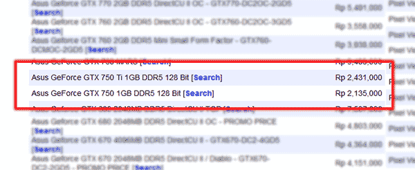 Dari pantauan kami pada sebuah situs toko online (www.enterkomputer.com), sudah tampak tersedianya harga GeForce GTX 750 dan GTX 750 Ti dari ASUS dan Digital Alliance (DA). Keduanya merupakan versi OC atau Overclocked. Ini berarti performanya akan berada di atas versi standar. Berikut adalah harga yang ditampilkan pada situs toko online tersebut.