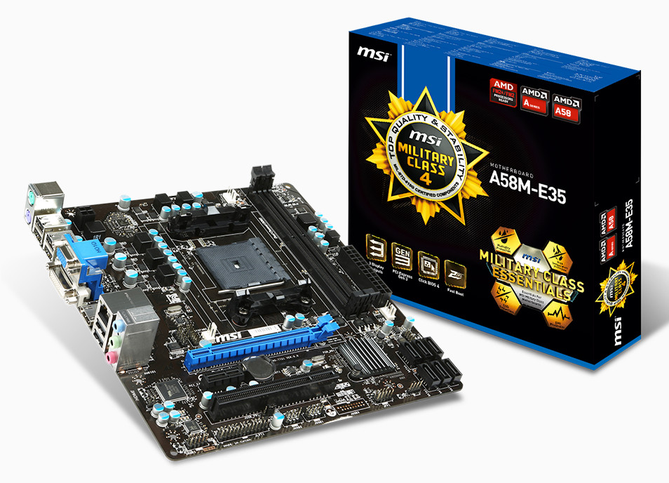 MSI kembali memperkuat lini motherboard FM2+ mereka. Perusahaan yang sudah cukup dikenal luas di dunia motherboard ini baru saja meluncurkan 3 motherboard FM2+ dengan mengunakan chipset seri A58. Produk yang diluncurkan adalah A581-G41 PC Mate, A58M-E35 dan A58M-E33. Motherboard baru MSI berchipset A58 ini mendukung APU terbaru dari AMD, “Kaveri”, serta tetap kompatibel dengan prosesor FM2 seperti Richland dan Trinity.