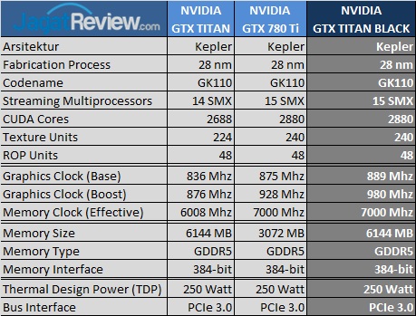 GeForce GTX TITAN Black berasal dengan chip yang serupa dengan GeForce GTX 780 Ti, yakni sebuah chip GK110 28 nm dengan 15 SMX (2880 CUDA Cores). Salah satu perbedaan utamanya adalah ukuran memori, dimana NVIDIA memberikan memori sebesar 6GB untuk GTX TITAN Black, bandingkan dengan 3GB pada GTX780 Ti. Berikutnya, GTX TITAN BLACK memiliki clock default sedikit lebih besar, 889Mhz Base Clock, dan 980Mhz Boost Clock. Kecepatan memori pada GTX TITAN BLACK setara dengan GTX 780 Ti, yakni 1750Mhz (efektif GDDR5-7000Mhz).