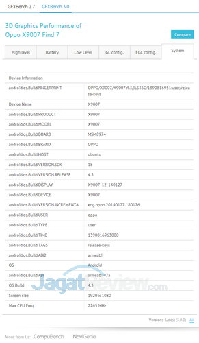 Untuk kinerja yang bocor, ternyata memang tenaga dari Adreno 330 bawaan Oppo Find 7 yang menggunakan Android Jelly Bean 4.3 ini dapat dibilang sangat kencang. Hal tersebut dapat dibuktikan dengan hasil GFXBench 3.0 yang dapat dilihat langsung pada website GFXBench sendiri. Sayangnya, belum ada “kebocoran” kinerja dari aplikasi benchmark lainnya untuk smartphone yang satu ini.