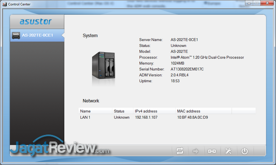 Ketika digunakan sebagai sebuah NAS, perangkat ini dapat dipasang ke jaringan dengan konfigurasi minimal. Pengguna hanya perlu membuka tool manajemen yang telah disiapkan oleh Asustor dan wizard yang ada akan membantu pengguna melakukan konfigurasi dasar, termasuk konfigurasi mode operasi storage dan shared folder. Setelah melalui tahap-tahap konfigurasi dasar dalam wizard tersebut, AS-202TE telah siap digunakan sebagai media penyimpanan dalam jaringan lokal. Sayangnya, ketika sampai di tampilan utama tool manajemen, kami sedikit kecewa karena Asustor tidak menampilkan informasi apapun terkait status operasi perangkat di layar utama tersebut.