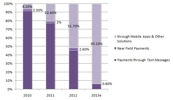 Adapun pendorong utama dari pertumbuhan yang sangat besar tersebut bukan lagi pada pembelanjaan mobile melainkan para transfer uang secara online, pembayaran kartu kredit serta aplikasi pembayaran mobile lainnya. Kebalikan dari itu, pembayaran yang dilakukan melalui SMS mengalami penurunan yang juga sangat tajam selama tiga tahun belakangan ini, yakni dari 92.5% di tahun 2010 menjadi 6.1% di tahun 2013. Di tahun 2012, sebanyak 93.1% pembayaran dilakukan melalui aplikasi pembayaran mobile atau melalui layanan lainnya.