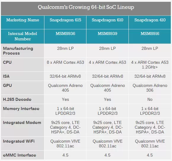 Kedua SoC tersebut sama-sama dibangun dengan proses fabrikasi 28-nm LP dan berbasiskan arsitektur chip ARM Cortex A53. Perbedaan signifikan di antara ketiganya, Snapdragon 610 dan 410 merupakan prosesor quad-core sementara Snapdragon 615 sudah mengusung sistem octa-core.
