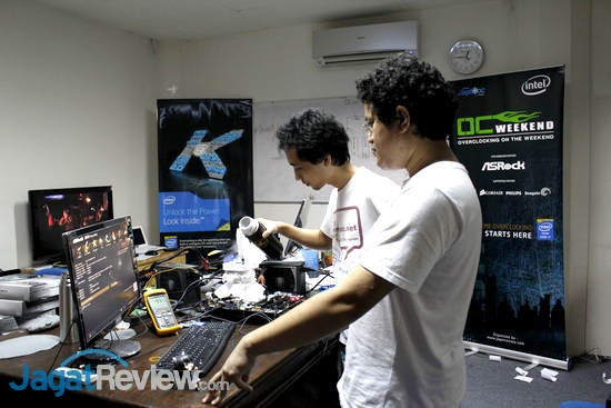 Sejak sore hari, Alva Jonathan dan Richard Sutanto dari Jagat OC telah menyiapkan berbagai hal terkait motherboard ASRock yang digunakan, seperti insulasi untuk extreme overclocking. Selain itu, tim panitia yang lain juga memastikan semua perlengkapan acara sudah siap digunakan, yaitu RAM dari Corsair, PSU dari Cooler Master, monitor dari Philips, dan HDD dari Seagate. Hasilnya? Semua perlengkapan telah siap digunakan di OC Weekend besok!