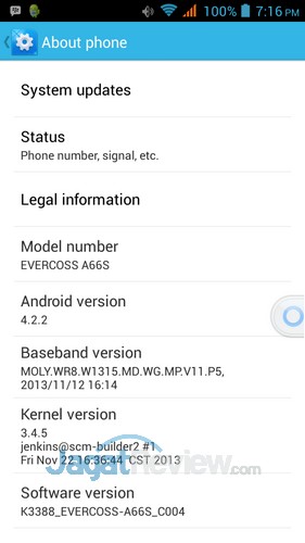 Sistem operasi yang digunakan oleh smartphone yang satu ini sudah menggunakan Android Jelly Bean 4.2.2. Memang, sistem operasi yang satu ini sepertinya sudah menjadi sebuah standar untuk smartphone-smartphone keluaran terbaru. Sayangnya, kami belum mendapatkan upgrade sistem operasi ke Jelly Bean 4.3 ataupun Kitkat 4.4, walaupun sang produsen pernah mengatakan bahwa mereka akan memperbarui sistem operasi yang ada pada Elevate A66s.