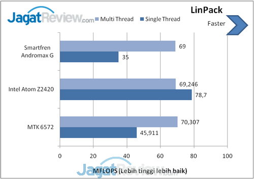 LinPack merupakan benchmark untuk CPU yang digunakan untuk mengukur seberapa cepat perangkat Android Anda. Hasilnya dalam bentuk MFLOPS(Million Floating Point Per Second). Semakin tinggi nilainya, semakin bagus.
