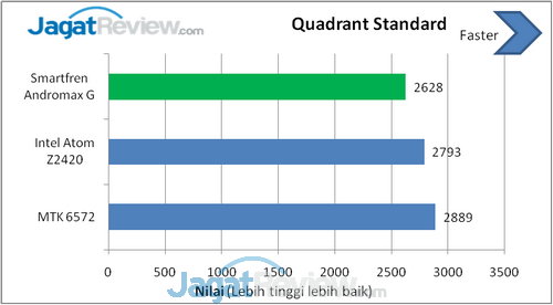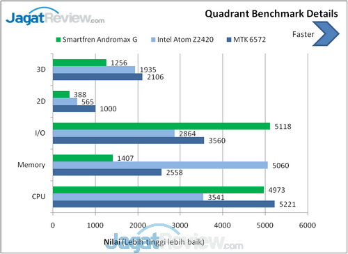 Quadrant adalah benchmark untuk CPU, I/O, dan grafis 3D. Versi yang kami gunakan adalah Standard Edition yang bisa diunduh secara gratis. Semakin tinggi nilai yang dihasilkan benchmark ini, semakin baik.