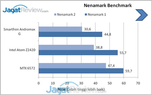 Nenamark adalah benchmark untuk OpenGL ES 2.0. Benchmark ini menampilkan efek grafis yang akan memaksa GPU (Graphic Processor Unit) bekerja secara maksimal. Semakin tinggi nilai yang didapat, semakin bagus.