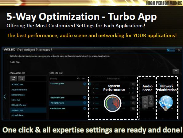 ASUS pun memperkenalkan ‘Turbo App’, sebuah control panel yang memberi anda akses pengaturan pada semua software yang terinstall pada PC anda, dimana anda bisa mengatur performa sistem, mode Audio, dan Mode Network pada setiap aplikasi secara spesifik, sesuai kebutuhan anda.