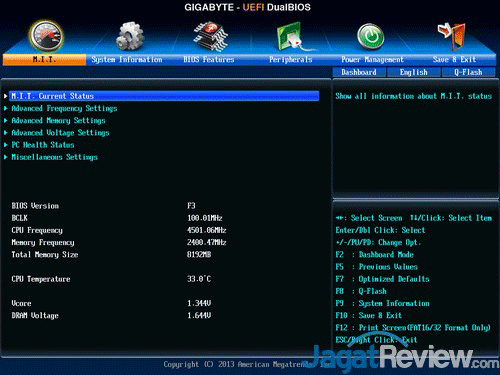 Gigabyte kembali menghadirkan UEFI BIOS yang umum dipakai di jajaran motherboardnya. Gigabyte menganut Dual BIOS Mode. Saat Anda memasuki BIOS pertama kali, Anda akan disajikan dengan BIOS dengan menu yang memudahkan Anda untuk merubah beberapa opsi, biasanya disebut Easy BIOS. Jika Anda ingin menggunakan BIOS yang lebih lengkap, Anda tinggal menekan F3 saat ada di Easy BIOS. Tentu saja, fitur tingkat lanjut sudah disediakan di motherboard ini untuk mengakomodir kebutuhan pengguna tingkat lanjut seperti overclocker. Setting BIOS untuk memaksimalkan performa prosessor Intel Haswell seri K dan memori tersedia lengkap disini. Tidak ketinggalan, setting standar motherboard platform Haswell juga tersedia lengkap.