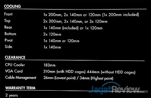 Tempat slot kipas ini dapat diatur ketinggiannya, dengan maksud untuk penyesuaian pemasangan water cooling yang mungkin memiliki bagian samping lebih lebar atau lebih kecil. Pada bagian atas casing, terdapat banyak controller yang dapat diatur.