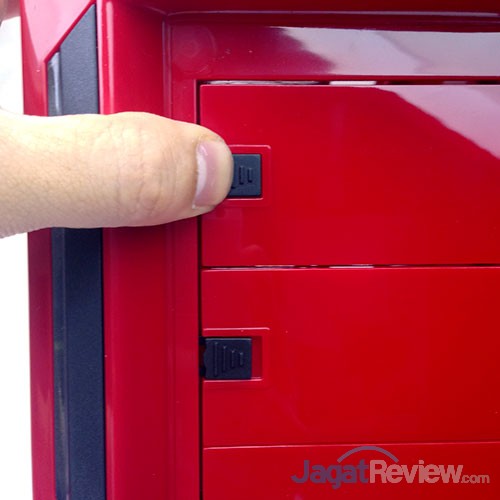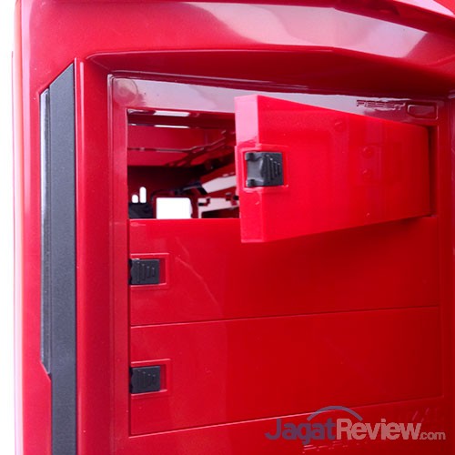 Setelah penampakan tombol reset, ternyata untuk membuka penutup drive bay 5.5″ ini cukup mudah. Dengan menekan kearah tengah dan ditarik kearah depan, penutup akan terbuka dengan mudah.