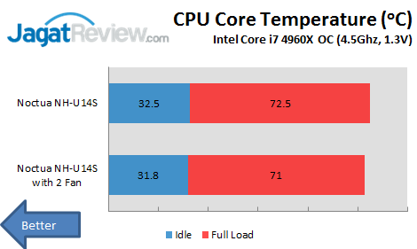 Saat kami menambahkan satu fan ke heatsink tersebut (push pull), kami mendapati perbedaan performa berkisar +\- 1.5oC. Saat full load, NH-U14S rata-rata suhu nya berkisar di angka 72.5oC, saat kami menambahkan 1 fan ke heatsink tersebut, suhu rata-rata yang kami dapatkan adalah 71oC.