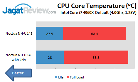 Saat kami mencoba Low Noise Adapter, fan berjalan pada kecepatan +/- 900RPM. Tercatat suhu rata rata saat full load berada di kisaran 65.5oC. Suhu ini lebih panas +\- 2oC daripada fan saat berputar pada kecepatan +\- 1500 RPM.Ini berarti dengan L.N.A anda bisa mendapat suara yang lebih sunyi, namun suhu HSF akan naik kurang lebih 2 C.