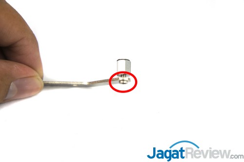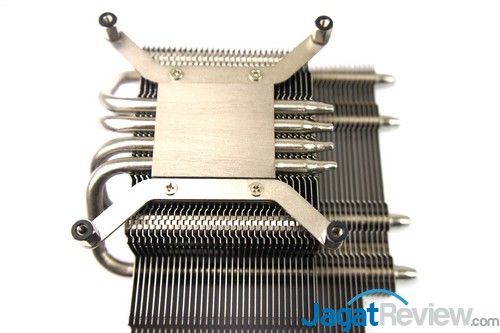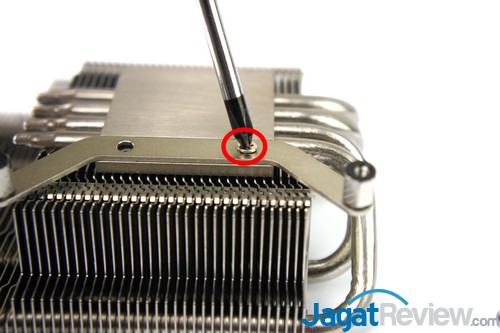 Setelah itu, pasang mounting bracket ke heatsink tersebut. Terdapat 4 baut yang harus Anda kencangkan untuk memasang mounting bracket tersebut.