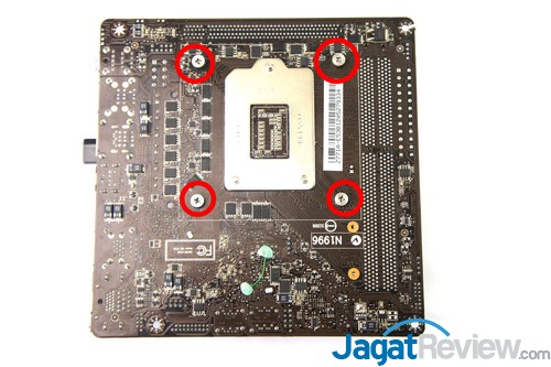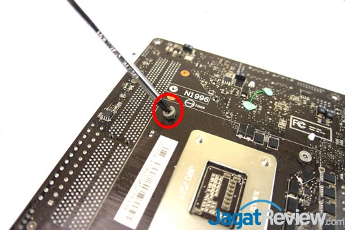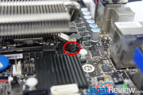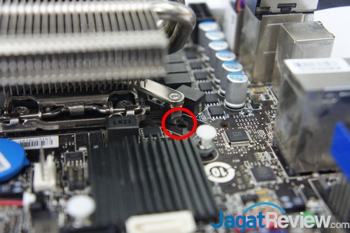 Setelah itu, sejajarkan nut yang sudah terpasang pada mounting bracket pada lubang di motherboard dekat dengan soket prosesor seperti gambar diatas.