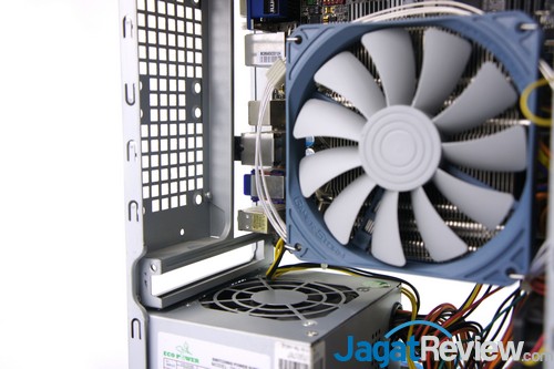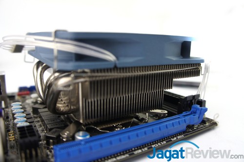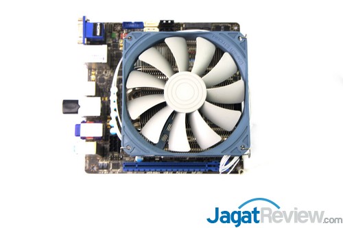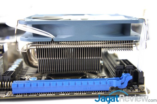 Setelah heatsink sudah dikunci, Anda dapat memasang fan dengan cara mengaitkan bracket fan ke heatsink.