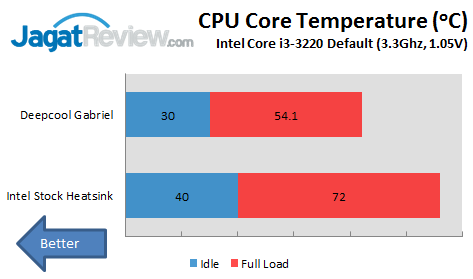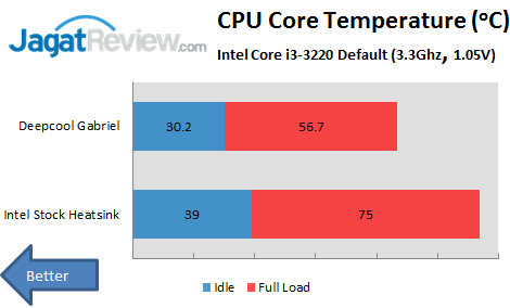 Saat kami melakukan pengujian LinX, Deepcool Gabriel ini mampu menahan panas dari Core i3 yang kami gunakan dengan sangat baik saat berada dalam kondisi semua core berajalan dengan maksimal, dengan perbedaan +/– 18oC dibandingkan dengan heatsink bawaan Intel. Saat full load, Deepcool Gabriel ini mampu menahan suhu di kisaran 54.1oC, sedangkan heatsink bawaan Intel berada di kisaran 72oC.