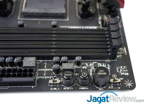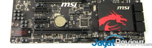 Untuk onboard button, terdapat Power button, Reset button, serta OC Genie button yang berfungsi untuk mengaktifkan fitur overclocking otomatis di motherboard. Tidak lupa juga, MSI menyertakan Clear CMOS jumper dan switch slow mode yang sangat berguna saat melakukan overcolocking.