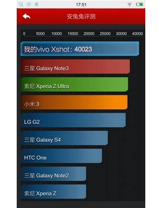 Angka yang diraih oleh Vivo Xshot adalah sebuah rekor baru! Selama ini, belum ada smartphone yang berhasil menyentuh angka 40 ribu di AnTuTu dan Xshot menjadi yang pertama melakukannya. Tak hanya itu, dari bagan skor di AnTuTu Vivo Xshot berada di posisi teratas mengalahkan Galaxy Note 3 dan Xperia Z Ultra.