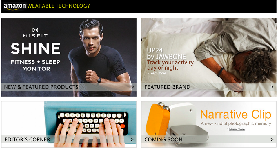 Seperti beberapa kategori khusus lainnya, toko Wearable Technology Amazon ini merupakan microsite dari toko online utama. Toko baru ini khusus diperuntukkan bagi produk-produk baru yang masuk dalam kategori wearable devices. Saat ini Samsung, Jawbone dan Go Pro menjadi beberapa nama terkemuka yang produknya ditawarkan Amazon di toko barunya ini. Selain itu Amazon juga nampaknya akan menawarkan produk wearable yang belum diluncurkan karena ada beberapa pre-order yang ditawarkan Amazon untuk beberapa produk yang memang belum beredar di pasaran, salah satunya Misfit Bloom Necklace.