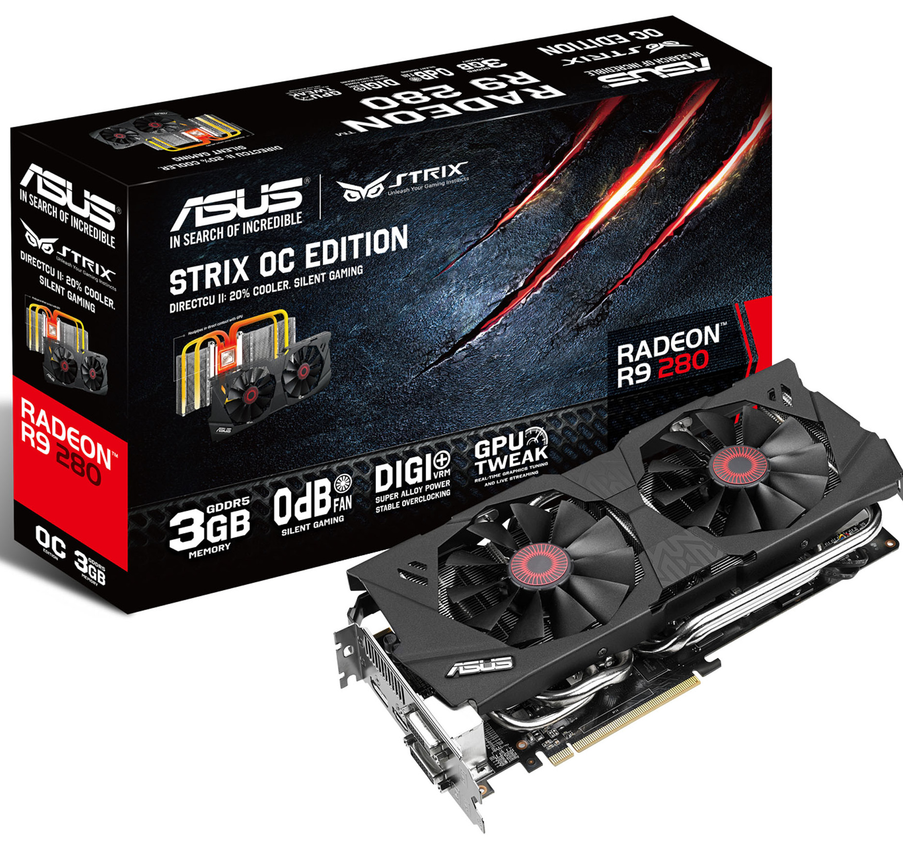 Radeon R9 280 memang tergolong graphics card yang masih baru. Memulai debutnya pada tahun 2014, R9 280 adalah penerus dari AMD seri 7, yaitu HD 7950. ASUS, sebagai perusahaan asal Taiwan yang terkenal dalam membuat graphics card yang memiliki banyak inovasi, baru baru ini mengeluarkan seri terbaru mereka untuk Radeon R9 280, yaitu Strix. ASUS Strix tersebut menggunakan pendingin bersistem Direct CU II namun dengan teknologi yang lebih baru. Ya, graphics card tersebut menawarkan 0 dBA cooling atau fan yang tidak berputar saat suhunya dibawah 65 °C. Teknologi ini memang mirip atau biasa dijumpai pada PSU kelas premium, jadi saat graphic card Anda sedang idle atau hanya memproses sedikit 3D, graphics card tersebut akan tetap hening selama suhunya masih dibawah 65 °C.
