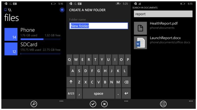 Dalam screenshoot gambar yang dibocorkan Belfiore tersebut, perangkat Windows Phone bisa mengakses file yang ada di memory internal maupun SD Card, menampilkan jenis file, memindahkan (copy/cut/paste) file, membuat folder baru, hingga terdapat fungsi search file.