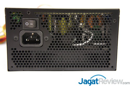 Bagian belakang dari PSU tersebut, dibuat berlubang agar panas dari PSU tersebut mudah terbuang. Terdapat juga tombol switch power.