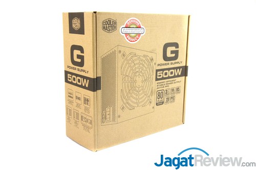 Inilah penampakan sisi depan boks Cooler Master G 500 watt ini. Memakai kardus berwarna coklat yang “eco friendly”, Cooler Master menampilkan beberapa fitur PSU tersebut yang di sisi depan ini.