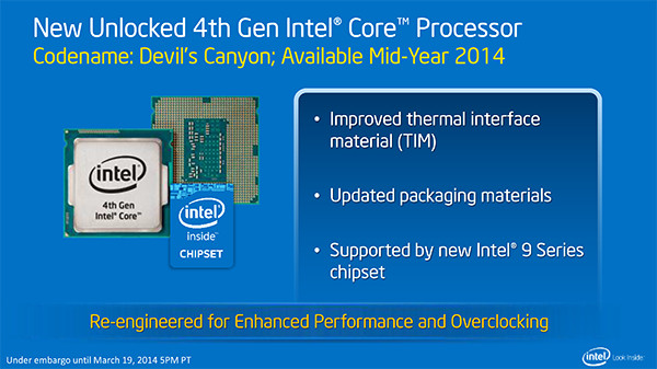 Core i7-4790K dan Core i5-4690K adalah prosesor yang sebelumnya lebih dikenal dengan codename “Devil’s Canyon“. Menurut rumor yang beredar, Intel melakukan “Handpick” pada prosesor “Haswell” dan memberikan fitur yang membuat prosesor ini dapat berjalan dengan voltase yang lebih tinggi. Tidak hanya pemilihan silikon yang lebih baik, “Thermal Interface Material” (TIM) yang berada diantara core dan Integrated Heatspreader (IHS) akan menggunakan bahan yang lebih baik dari sebelumnya.