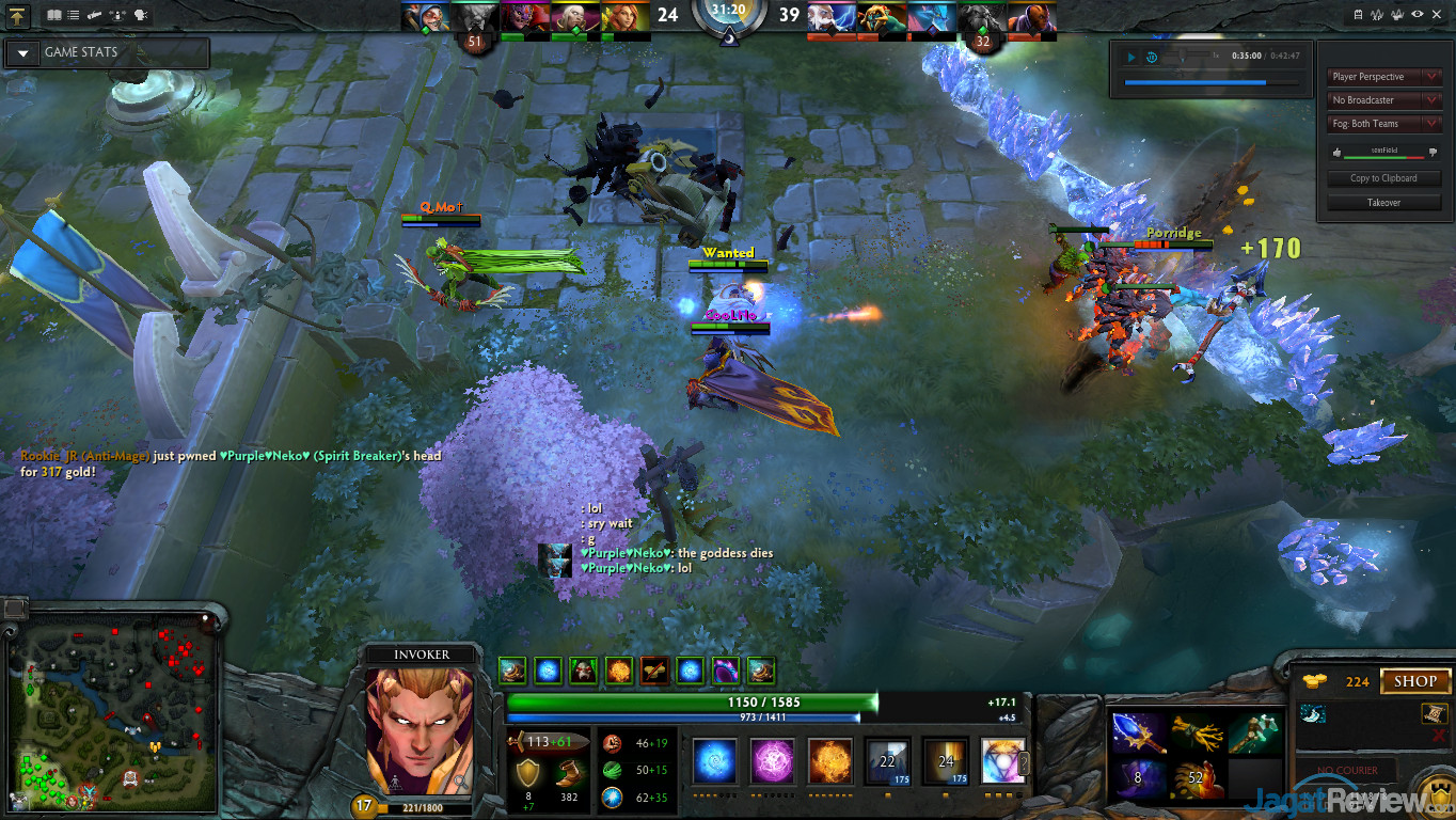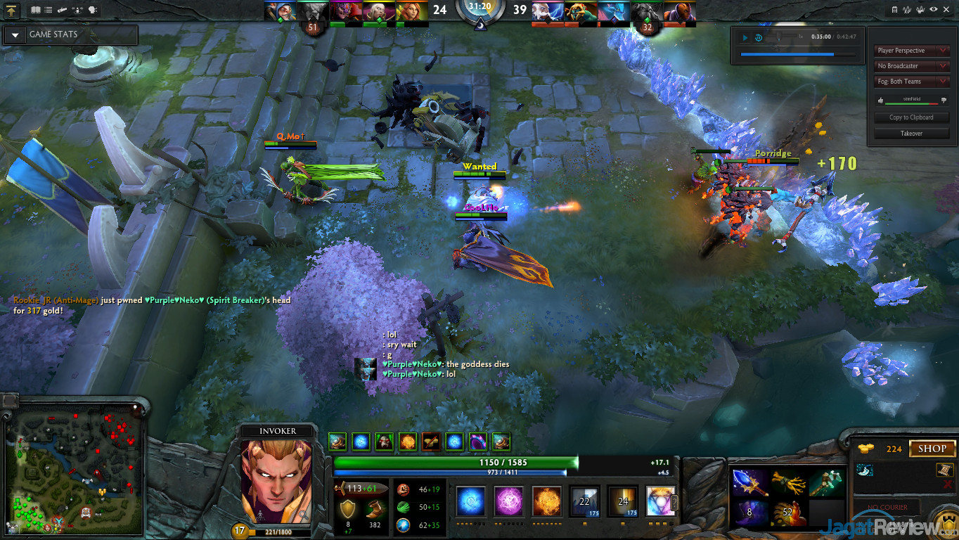 Di scene tersebut terdapat beberapa hero yang mempunyai skill yang termasuk cukup ‘berat’ membebani GPU dan CPU. Sebut saja Invoker yang mengeluarkan beberapa skill seperti, Tornado, meteor, EMP, dan ice path. Belum lagi Zeus yang mengeluarkan ultimate skill-nya yaitu Thundergod’s Wrath. Ultimate skill tersebut sering sekali menyebabkan penuruan framerate. Belum lagi terdapat beberapa hero yang mempunyai skill membelah diri seperti Meepo dan Anti Mage yang menggunakan item manta style yang semakin menambah jumlah objek yang ada. Oleh sebab-sebab diatas, kami rasa scene tersebut sudah cukup mewakili permainan DotA 2 yang bisa membebani PC modern.