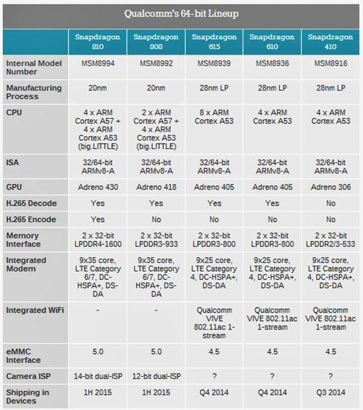 “Snapdragon 615 akan menyasar ke segmen smartphone mid-range, sedangkan chip 64-bit di Snapdragon 810 dan Snapdragon 808 ditujukan untuk smartphone high-end yang mendukung teknologi jaringan 4G,” kata seorang sumber industri, seperti dikutip dari DigiTimes.