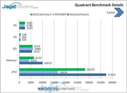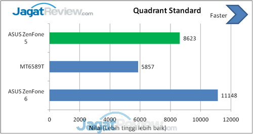 Quadrant adalah benchmark untuk CPU, I/O, dan grafis 3D. Versi yang kami gunakan adalah Standard Edition yang bisa diunduh secara gratis. Semakin tinggi nilai yang dihasilkan benchmark ini, semakin baik.