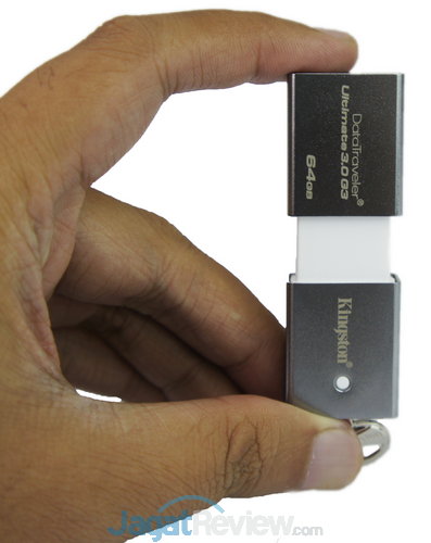 Desainnya capless alias tanpa penutup. Seperti diketahui tutup pada flash disk sering kali menjadi masalah karena mudah hilang. Di bagian belakang, Kingston menyediakan keyring untuk menambahkan gantungan kunci, tali, dan semacamnya.