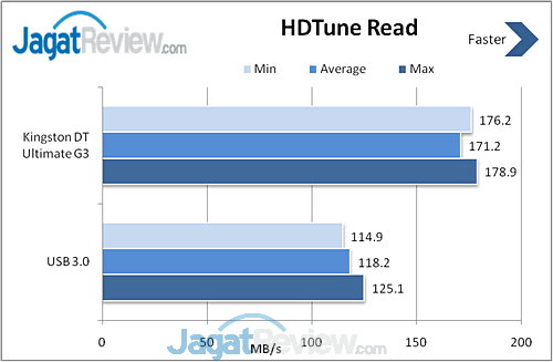 Tak hanya memenuhi janjinya, Kingston DT Ultimate 3.0 G3 ternyata mampu melampaui apa yang diharapkan. Dalam pengujian menggunakan CrystalDisk Mark kecepatan Read mencapai 180,9MB/s dan Write 83,03MB/s.