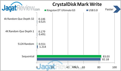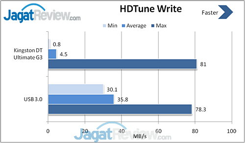 Meski hasil tes Read menggunakan HDTune menunjukkan performa yang sangat baik, terjadi anomali saat kami menguji kecepatan Write dari flash disk ini. Sempat menyentuh angka terendah di 0,8MB/s dan Max 81MB/s, kecepatan rata-ratanya hanya 4,5MB/s. Ada kemungkinan HDTune tidak cocok digunakan pada Kingston DT ultimate 3.0 G3.