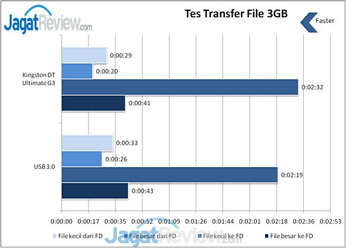 Tidak hanya memenuhi janjinya, secara performa Kingston DT ultimate 3.0 G3 bahkan mampu melebihi apa yang diharapkan. Beberapa pengujian yang kami lakukan di atas adalah buktinya. Dalam tes real-life saat melakukan transfer file sebesar 3GB pun flash disk ini tak butuh waktu yang lama.