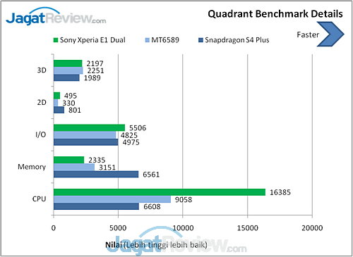 Quadrant adalah benchmark untuk CPU, I/O, dan grafis 3D. Versi yang kami gunakan adalah Standard Edition yang bisa diunduh secara gratis. Semakin tinggi nilai yang dihasilkan benchmark ini, semakin baik.
