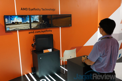 Disini AMD memamerkan demo game Battlefield 4 yang berjalan pada 3(tiga) Display 4K, dengan total resolusi sebesar 11520 x 2160. Bukan main-main, total pixel yang ada di konfigurasi ini mendekati nilai 25 MegaPixel! AMD menggunakan prosesor AMF FX-8350 yang di-overclock ke 5Ghz, dan sebuah Single GPU berbasis Radeon R9 untuk bisa menjalankan demo ini di tingkat framerate yang nyaman.