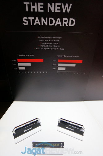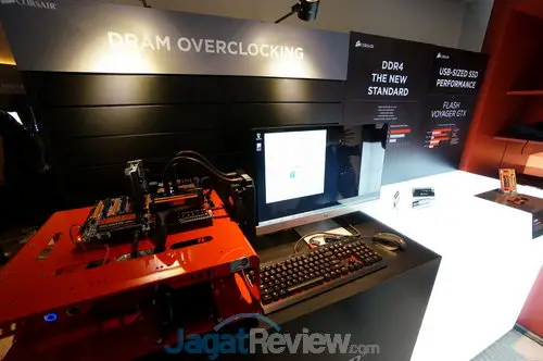 Pada ruangan ini kami melihat jajaran produk memori RAM, dari Corsair dan bahkan beberapa ram DDR4 yang masih dalam tahap pengembangan atau prototipe.