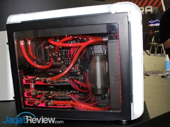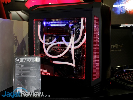 Berbeda dengan Atlas, Aegis adalah casing untuk Micro ATX/Mini ITX dengan desainnya yang menarik. Logo di bagian depan produk ini tampil dalam display digital dan bisa diubah oleh pengguna melalui tool khusus. Ukurannya cukup besar sehingga bisa menampung radiator hingga 360 mm.
