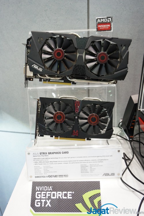 Saat pertama kali kami mendatangi booth ASUS bagian Strix, terlihat dua buah VGA yang sudah dilengkapi dengan pendingin ala Strix, yaitu AMD R9-280 OC dan Nvidia GTX 750Ti OC. AMD R9 280 OC dilengkapi dengan GPU clock sebesar 980 MHz, video memory 3GB GDDR 5, memory clock sebesar 5200 MHz dan juga memory interface sebesar 384 bit. Sedangkan untuk 750Ti sendiri tidak dicantumkan GPU clocknya, namun memiliki memory clock 5400 MHz, video memory 2GB GDDR5 serta memory interface 128 bit.