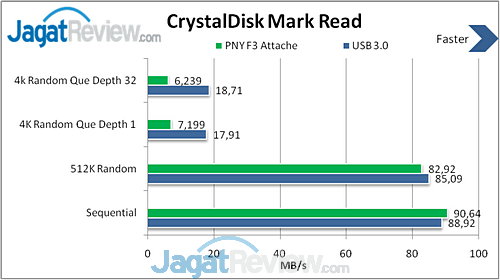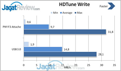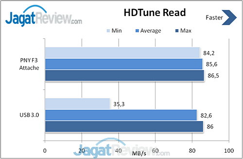 Seperti pada pengujian menggunakan CrystalDisk Mark, di HDTune juga terlihat PNY F3 Attache mampu memberikan performa yang cukup baik dan mengimbangi kecepatan pembandingnya.