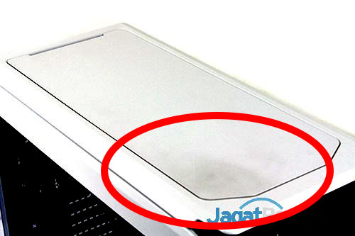 Perlu diperhatikan ketika melakukan pemasangan komponen, di bagian dalam casing, pasti Anda akan memposisikan casing ini dalam keadaan tidur. Nah jika alas yang digunakan tidak diperhatikan maka kemungkinan acrylic pada daun pintu akan lecet. Jadi, Anda ahrus ekstra hati-hati ketika melakukan pemasangan sistem kedalam casing. Bahan high-gloss poly-carbonate yang digunakan ini lebih rentan terhadap kotor, kami tidak sengaja memegang casing ini dengan tangan kotor, maka yang terjadi adalah sebagai berikut: