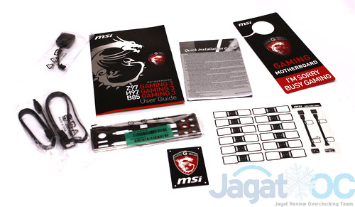 Kemasan MSI H97 dibuat dengan warna khas MSI Gaming series: merah-hitam, dengan tambahan sebuah logo naga. Pada bagian perlengkapan, anda akan menemui: